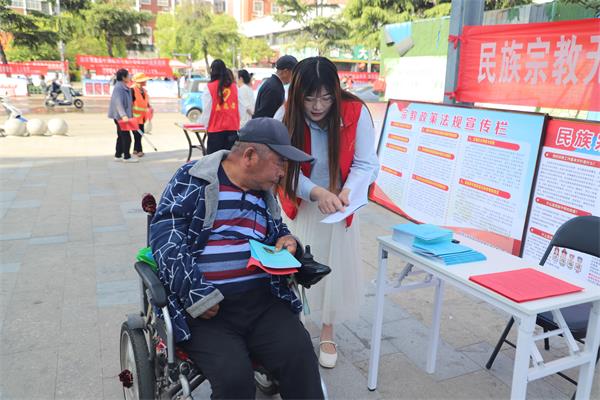 活动现场,志愿者们围绕“铸牢中华民族共同体意识”这一主线,通过悬挂宣传标语、设立咨询台、发放宣传资料、现场讲解等多种方式,动员群众学习民族宗教的有关法律法规和政策,引导辖区群众要牢固树立正确的祖国观、历史观、民族观,做维护民族宗教领域和谐稳定的支持者和践行者,为实现中华民族伟大复兴作出更大的贡献。