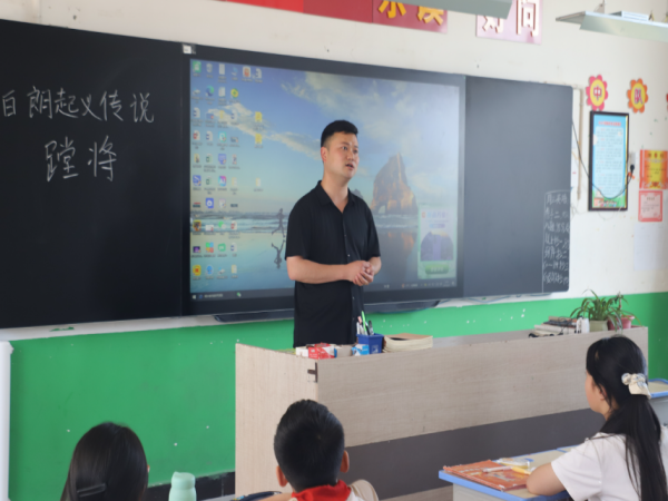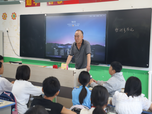 6月5日上午,在石龙区中心小学,市级非物质文化遗产代表性传承人刘向阳正在课堂上讲述汝瓷的历史故事和烧制技艺。与此同时,在另一间教室里,区级非物质文化遗产白朗起义传说代表性传承人柯旭涛在向学生们讲述白朗起义的故事。